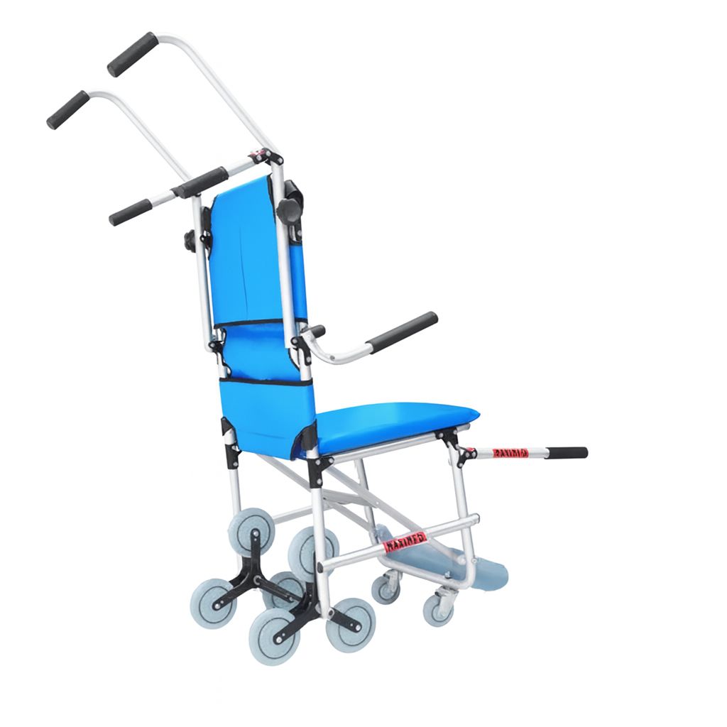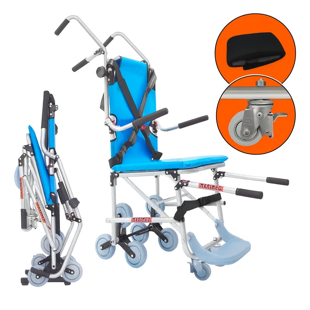 - Sistema de locomoção: Trilhos rolantes em borracha de alta aderência, desenvolvidos para subir e descer escadas com segurança.